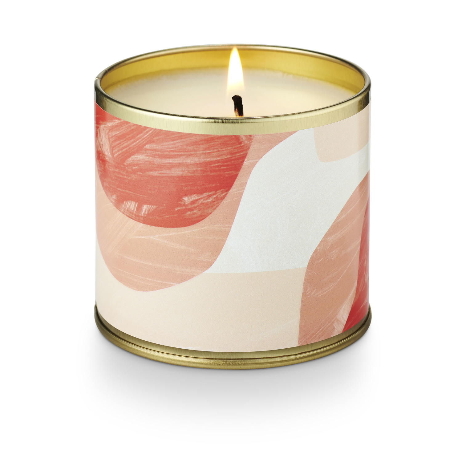 A painterly tin candle with organic shapes and movement, lidded in matte gold.